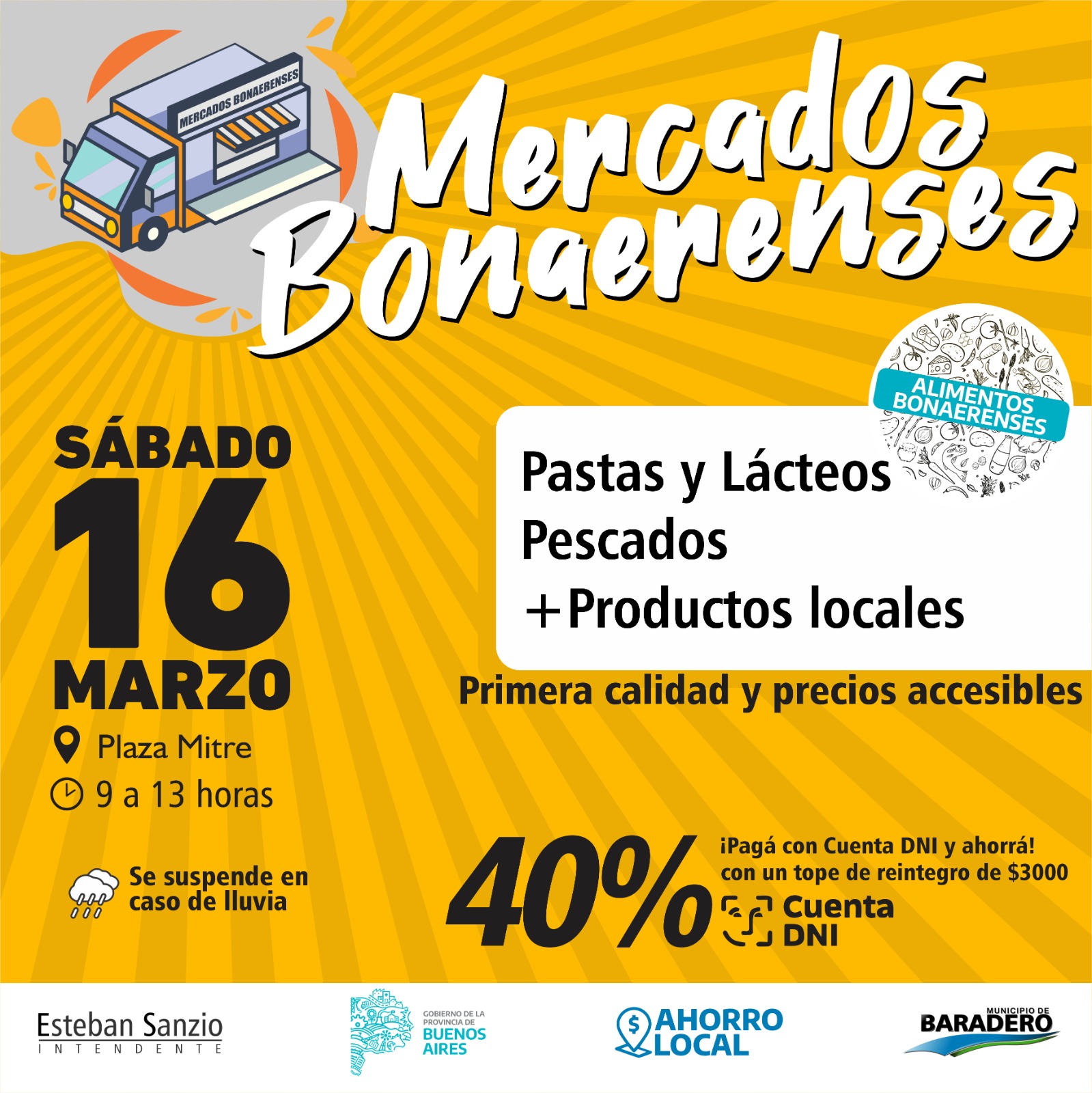 Este sábado 16 de febrero, de 9 a 13 horas, tendrá lugar una nueva edición de Mercados Bonaerenses, con la oferta de productos de primera calidad a precios más que accesibles. Además podrán aprovecharse los descuentos del 40 por ciento pagando con Cuenta DNI, con tope de reintegro de 3 mil pesos por persona.