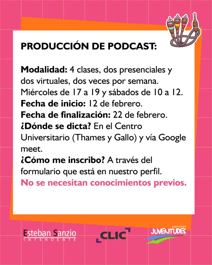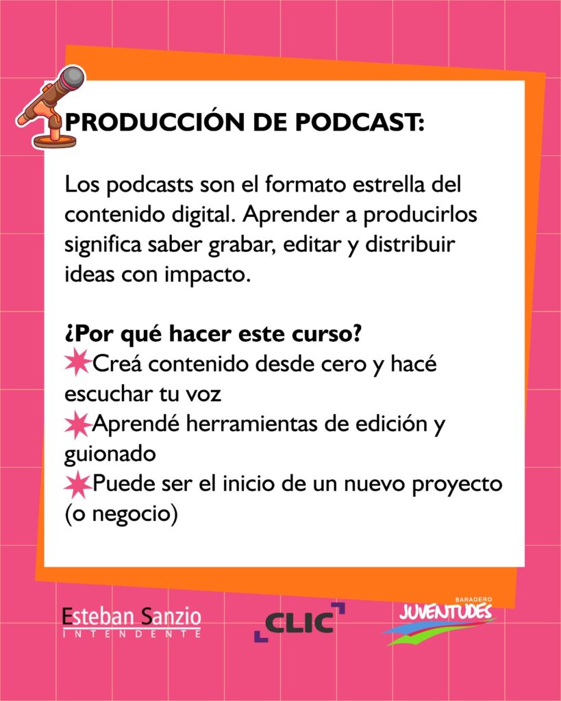 Objetivos: Capacitar a jóvenes en el desarrollo de un podcast desde su concepción hasta su publicación. Promover la creatividad y la expresión de las juventudes a través de herramientas digitales. Fomentar el trabajo en equipo y la producción colaborativa de contenidos. Brindar herramientas técnicas y narrativas para producir podcasts de calidad.