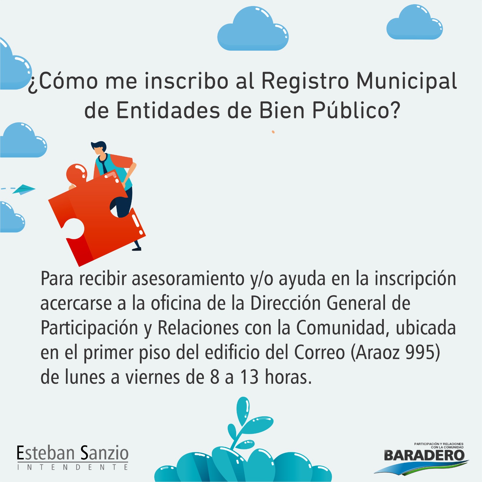 El Municipio de Baradero, a través de la Dirección General de Participación y Relaciones con la Comunidad, informa a las instituciones intermedias que pueden acceder al Registro Municipal de Entidades de Bien Público. Este registro permite llevar un control sobre instituciones sin fines de lucro y brindar asistencia en caso de que así lo requieran.