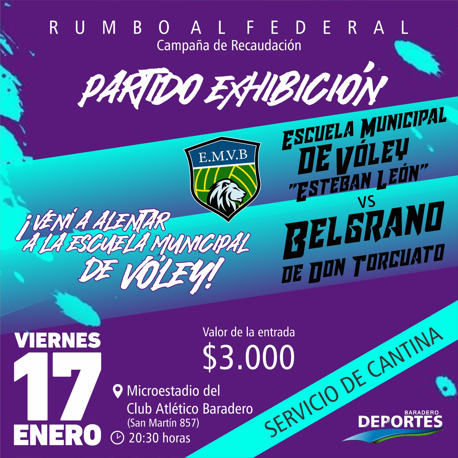 El viernes 17 de enero a las 20:30 horas la Escuela Municipal de Vóley se enfrentará a Belgrano de Don Torcuato, equipo que también participa del Federal, en un partido que se realizará en el Microestadio del Club Atlético Baradero. La entrada tendrá un valor de $3000 por persona, además contará con servicio de cantina.