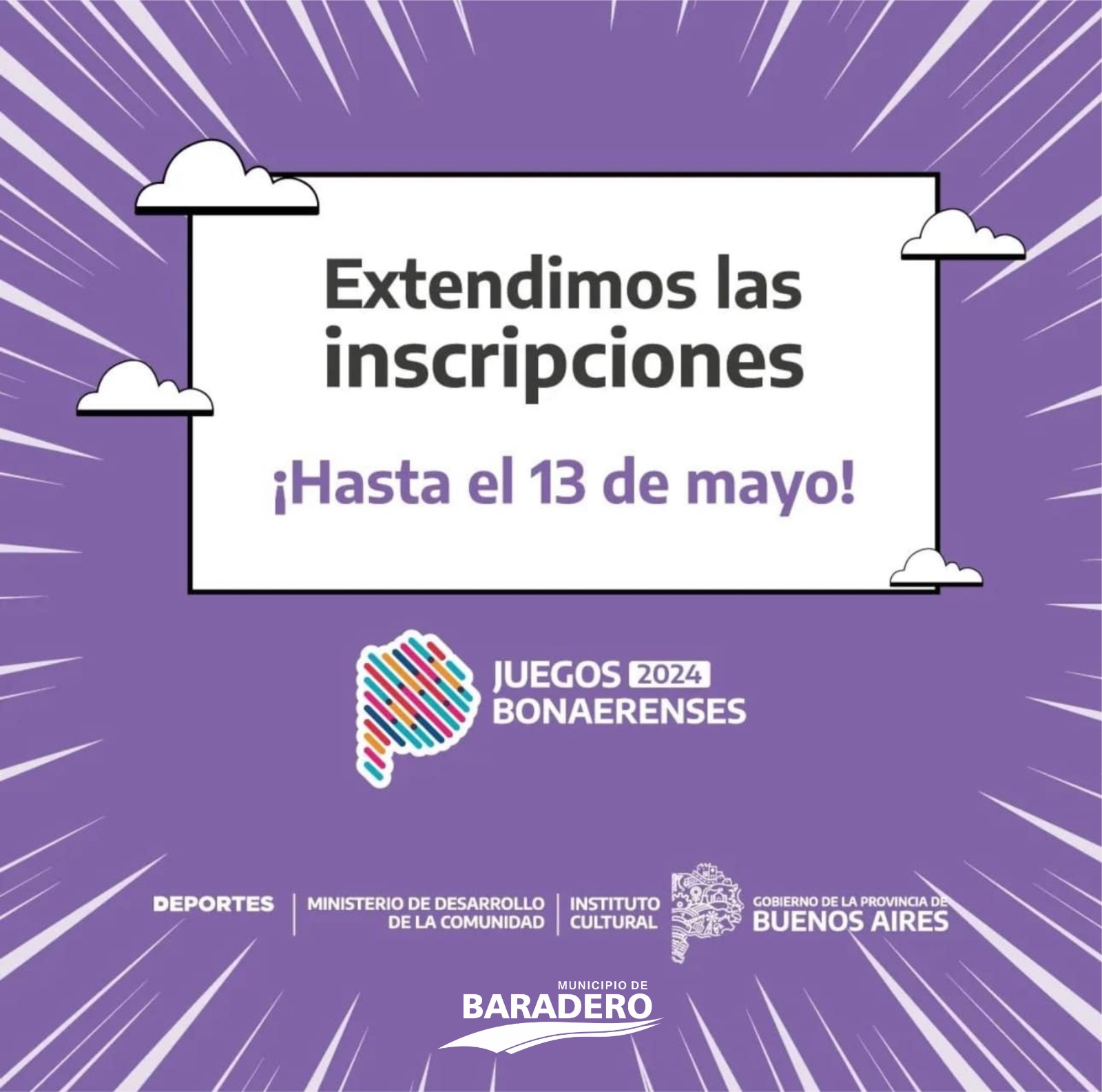 La Secretaría de Cultura, Educación, Comunicación y Deportes del Municipio de Baradero informa que se extendió el plazo de inscripción para participar de las instancias de la edición 2024 de los Juegos Bonaerenses. La nueva fecha límite para hacerlo es el lunes 13 de mayo.
