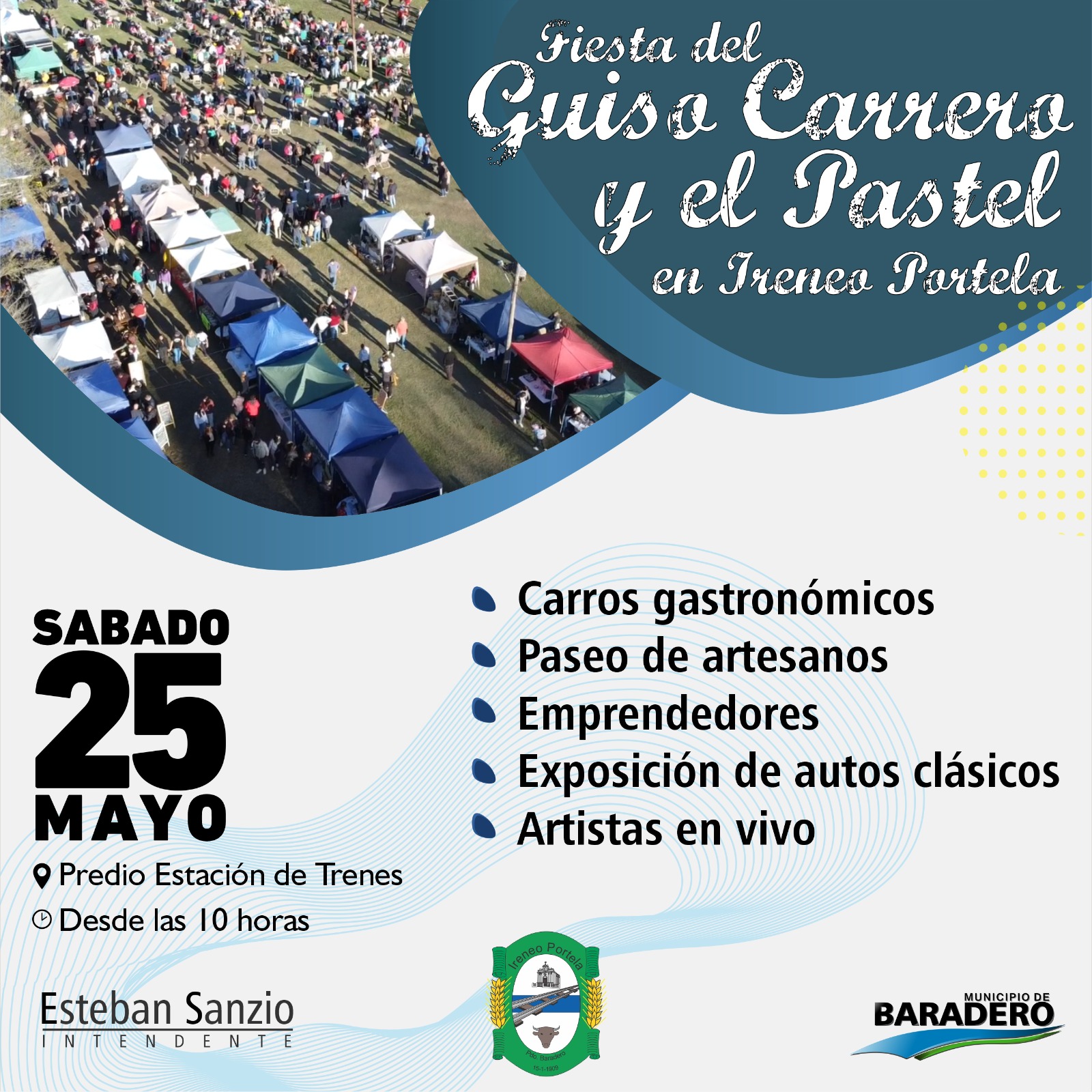 El próximo sábado 25 de mayo se llevará adelante la Fiesta del Guiso Carrero y el Pastel en el Predio Manuel Belgrano de Ireneo Portela en el marco de un nuevo aniversario de la Revolución de Mayo. El evento comenzará a partir de las 10 de la mañana y es totalmente gratuito.