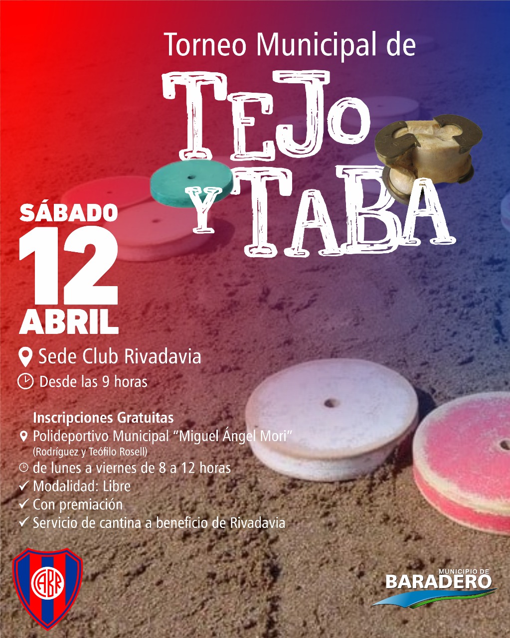 El Municipio de Baradero, a través de la Dirección de Deportes de la Secretaría de Cultura, Educación, Comunicación y Deportes, invita a la comunidad a participar del Torneo Municipal de Tejo y Taba a realizarse el sábado 12 de abril, desde las 9:00 horas en el Club Rivadavia.