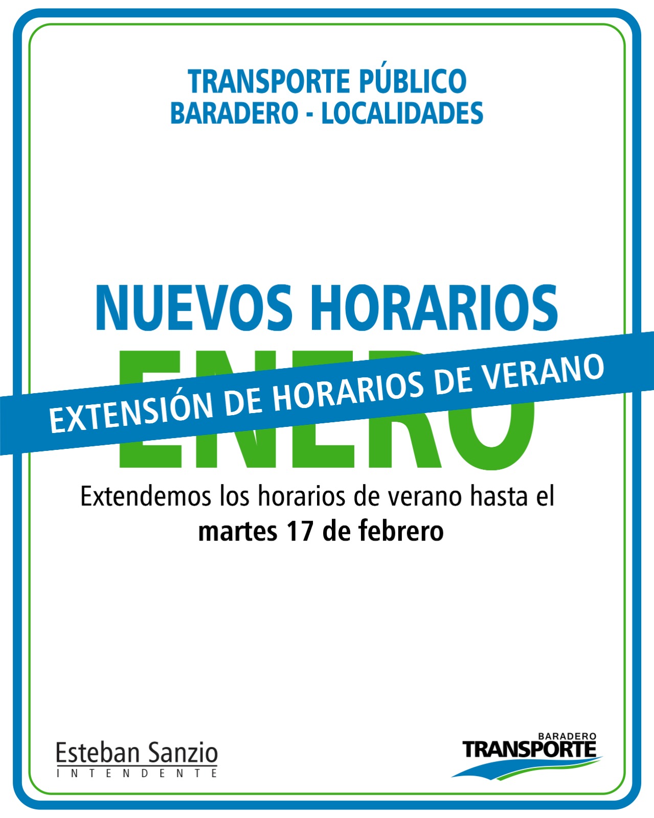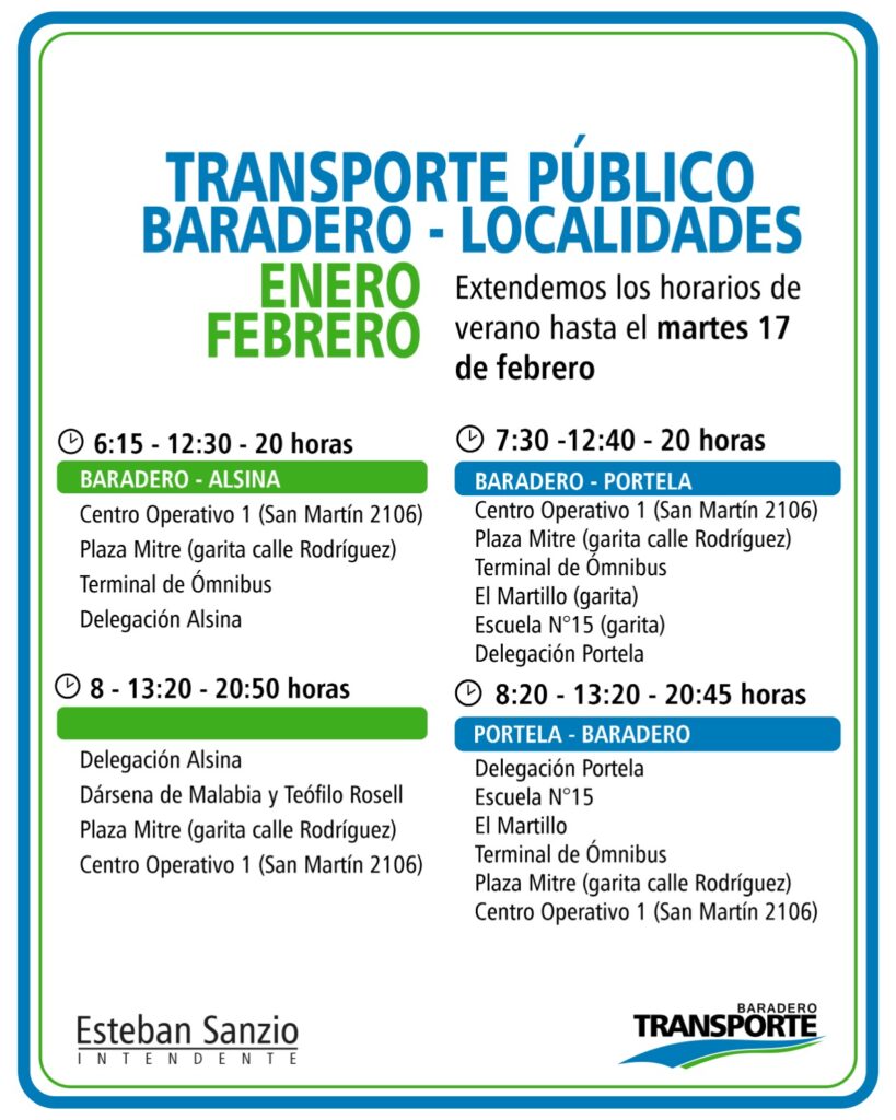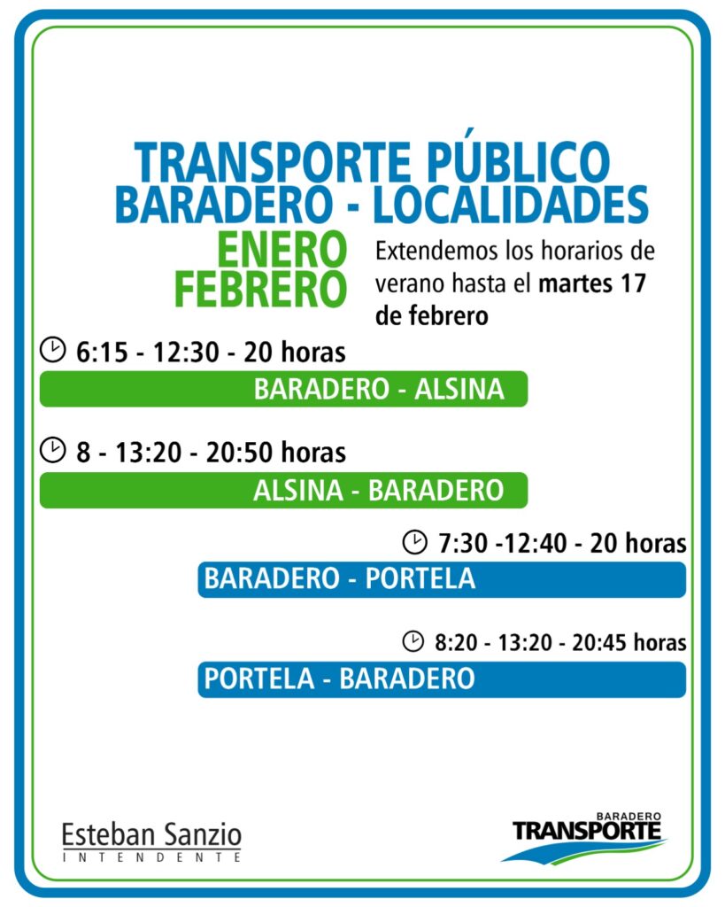 El Municipio de Baradero informa a la comunidad que el horario de verano del servicio de transporte público que conecta la ciudad de Baradero con las localidades de Alsina y Portela se extiende hasta el martes 17 de febrero de 2026 inclusive.