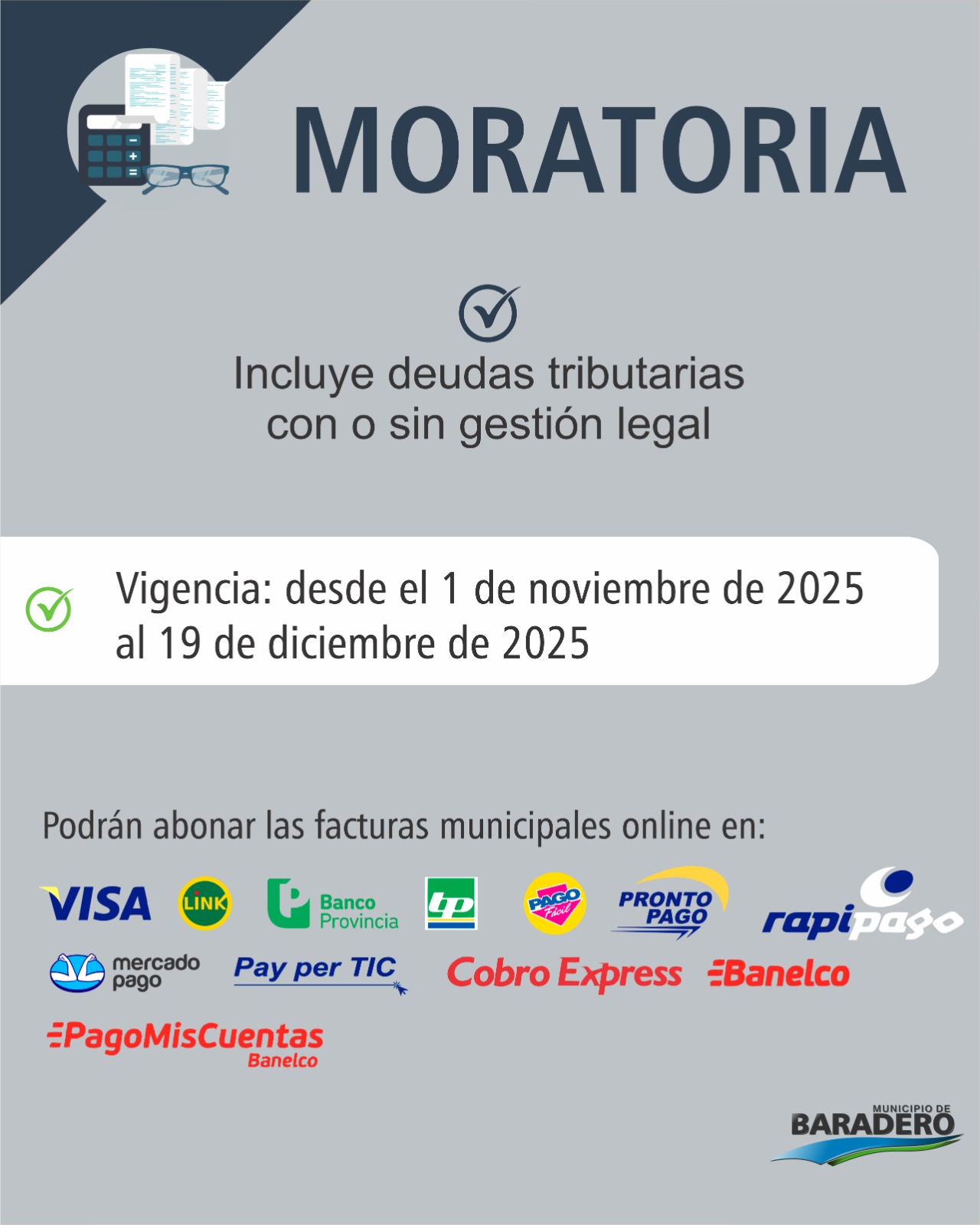 El Municipio de Baradero informa a la comunidad que quedan pocos días para acogerse al plan de regularización de deudas de tasas municipales con beneficios exclusivos e improrrogables. El plazo de adhesión a esta moratoria, que incluye deudas tributarias con o sin gestión legal, estará vigente hasta el 19 de diciembre de 2025.
