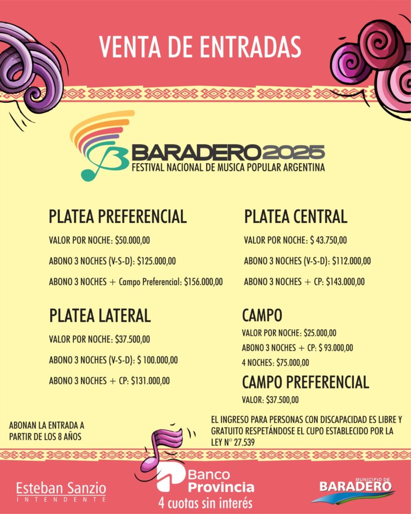 El Municipio de Baradero informa los nuevos precios de la venta de entradas del Festival de Música Popular Argentina Baradero 2025.