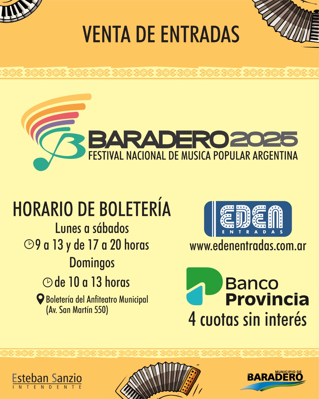 El Municipio de Baradero informa los nuevos precios de la venta de entradas del Festival de Música Popular Argentina Baradero 2025.