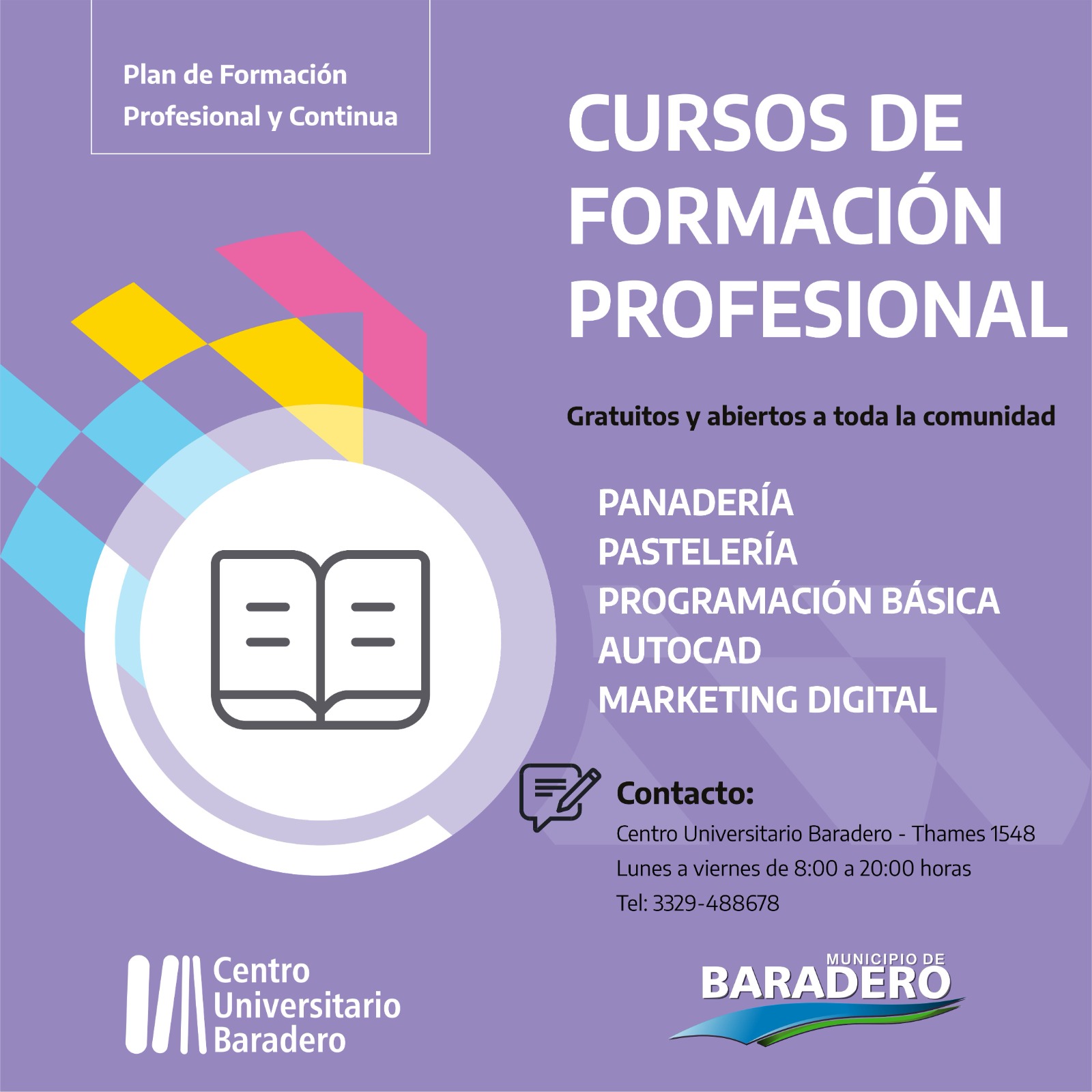 El Municipio de Baradero, a través del Ministerio de Trabajo, Empleo y Seguridad Social de la Nación, comunica que se encuentra abierta la inscripción para cursos de formación profesional en el Centro Universitario Baradero (Thames 1584). Los mismos son gratuitos y abiertos a la comunidad y destinados a personas mayores de 18 años.