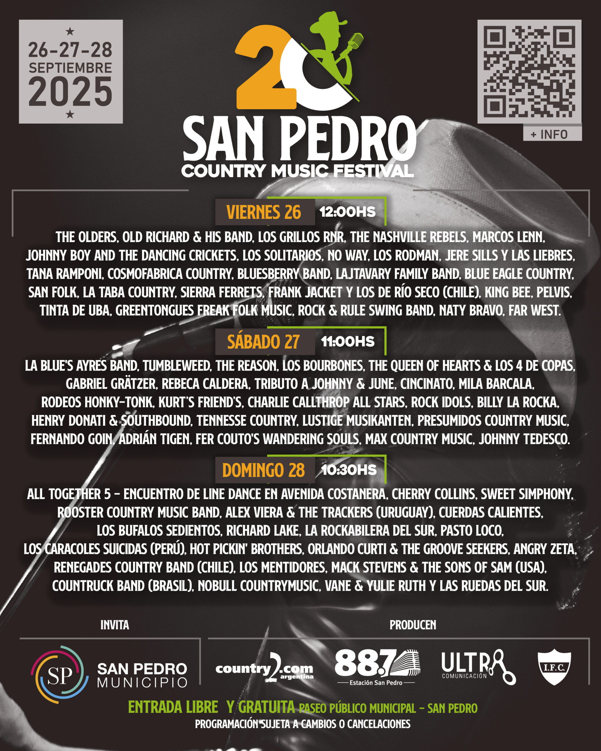 Veintidós años después de aquel inolvidable primer encuentro en el Anfiteatro del Vía Crucis, San Pedro vuelve a ser escenario de una celebración única. El San Pedro Country Music Festival llega a su vigésima edición con entrada libre y gratuita, reafirmando su lugar como uno de los eventos más emblemáticos del calendario cultural y turístico de la ciudad. La fiesta es producida por Country2.com e Independencia Fútbol Club, con el imprescindible acompañamiento de la Municipalidad de San Pedro.